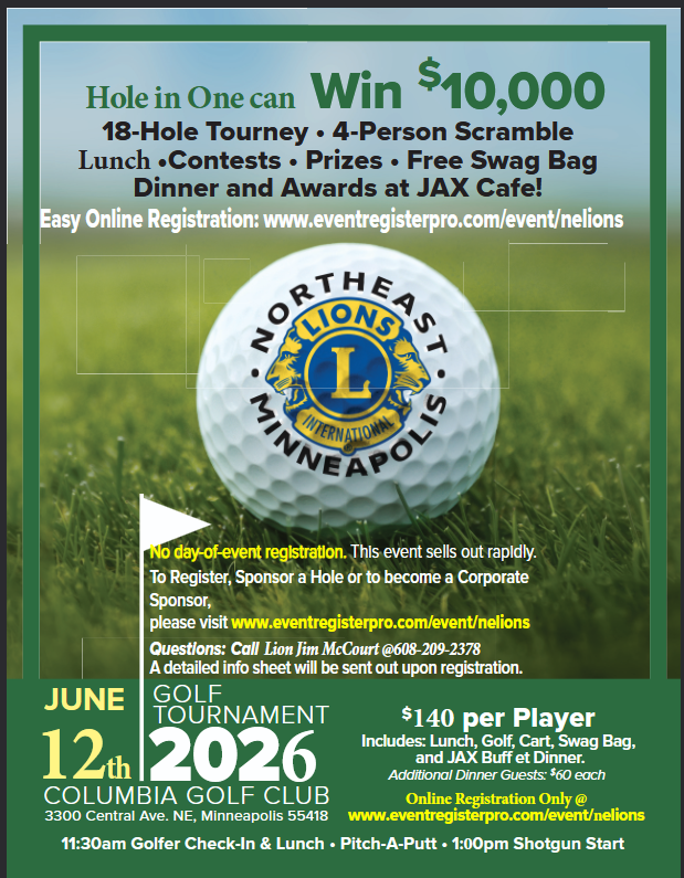 Join us at an upcoming meeting and check out the great opportunities to serve our community, make new friends, and expand your business contacts. We meet on the 2nd Tuesday monthly at 6:30 pm. To learn of the location of our next meeting please email us at info@NELions.org or text 612.408.0242 Heidi.